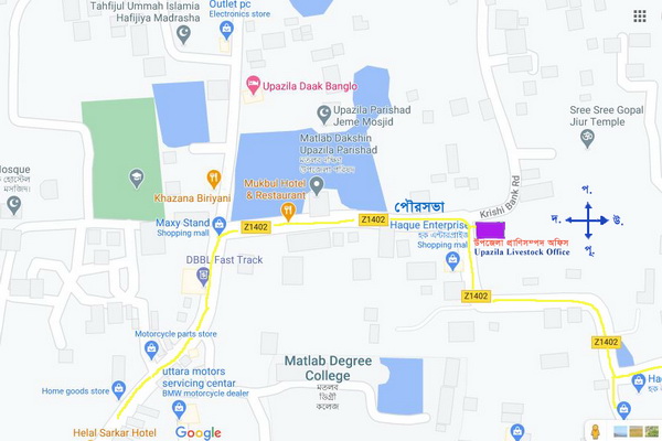 উপজেলা পরিষদ থেকে ম্যাক্সি স্ট্যান্ড মোড় ও পৌরসভা ভবন হয়ে প্রায় ৩০০ মিটার উত্তর-পূর্বে তিন রাস্তার মোড়ের উত্তর পাশে অবস্থিত দ্বিতল ভবনটিই (চিত্রে বেগুনী রঙের চতুর্ভুজ) হচ্ছে উপজেলা প্রাণিসম্পদ অফিস, মতলব দক্ষিণ, চাঁদপুর।
